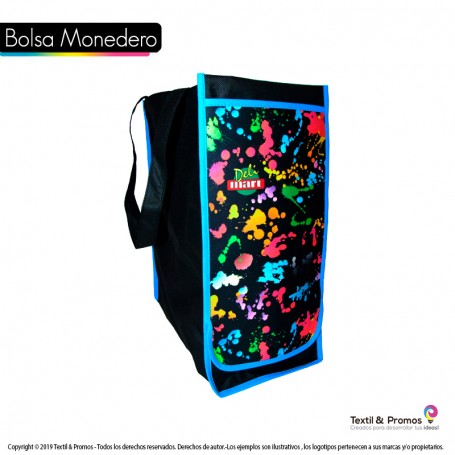 Bolsa plegable tipo monedero fabricada en non woven medidas 33 x 42 cm impresa en sublimación o serigrafía , terminado en broches de presión de plástico y bies de non woven.